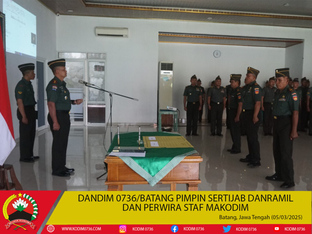 - Batang – Dandim 0736/Batang Letkol Inf Ahmad Alam Budimana memimpin Upacara dalam rangka mutasi jabatan sejumlah Danramil dan Perwira Staf Jajaran Kodim 0736/Batang. Mereka bertukar posisi sebagai Danramil ataupun tukar posisi antara Danramil dan Perwira Staf di Aula Makodim, Kabupaten Batang, Kamis (27/3/2025).