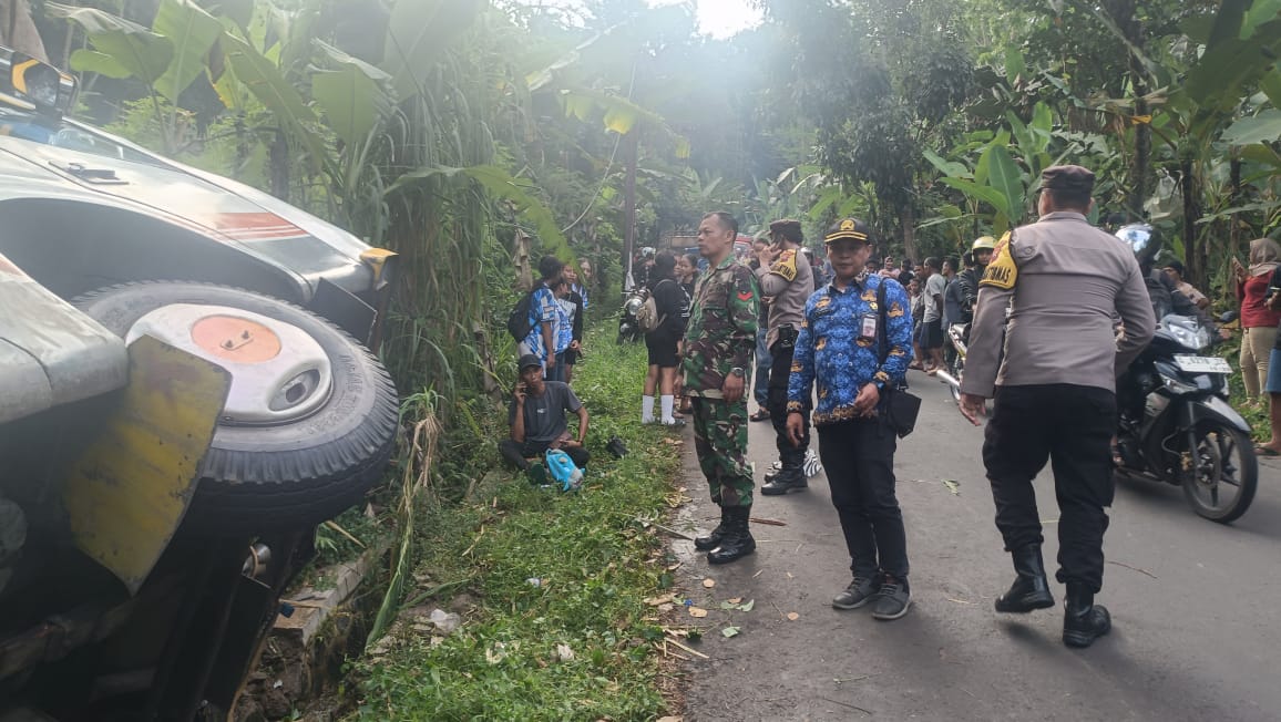 Babinsa dari Koramil 01/Subah, Kodim 0736/Batang, Koptu Agus bersama anggota Bhabinkamtibmas Polsek Subah setelah mendapat informasi langsung menuju lokasi kecelakaan bus yang tergelincir.