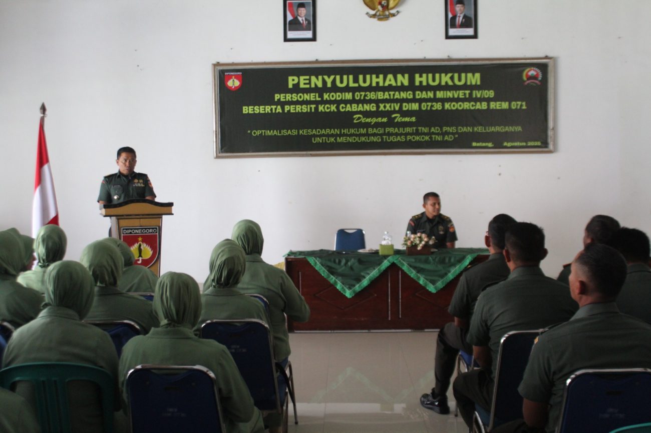 Batang – Guna meminimalisir dan mencegah terjadinya pelanggaran di jajaran satuan TNI AD, Tim Kumdam IV/Diponegoro (Hukum Kodam IV/Diponegoro) memberikan penyuluhan hukum kepada para prajurit, PNS dan Persit Kodim 0736/Batang, bertempat di Aula Makodim setempat. Kamis (14/8/2025).