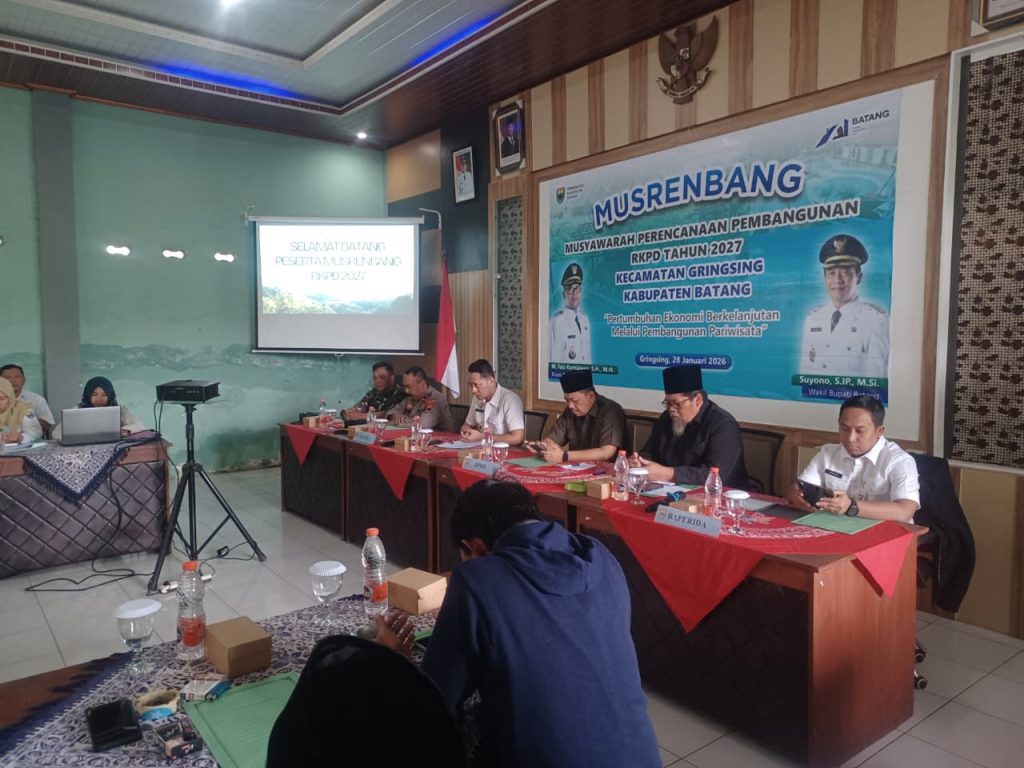 Pada hari rabu,28 Januari 2026 pukul 09.00 wib s.d selesai bertempat di Aula Kecamatan Gringsing, telah dilaksanakan kegiatan”Musyawarah Perencanaan Pembangunan RKPD Tahun 2027 Kec. Gringsing Kab. Batang dengan tema “Pertumbuhan Ekonomi Berkelanjutan melalui Pengembangan Pariwisata”