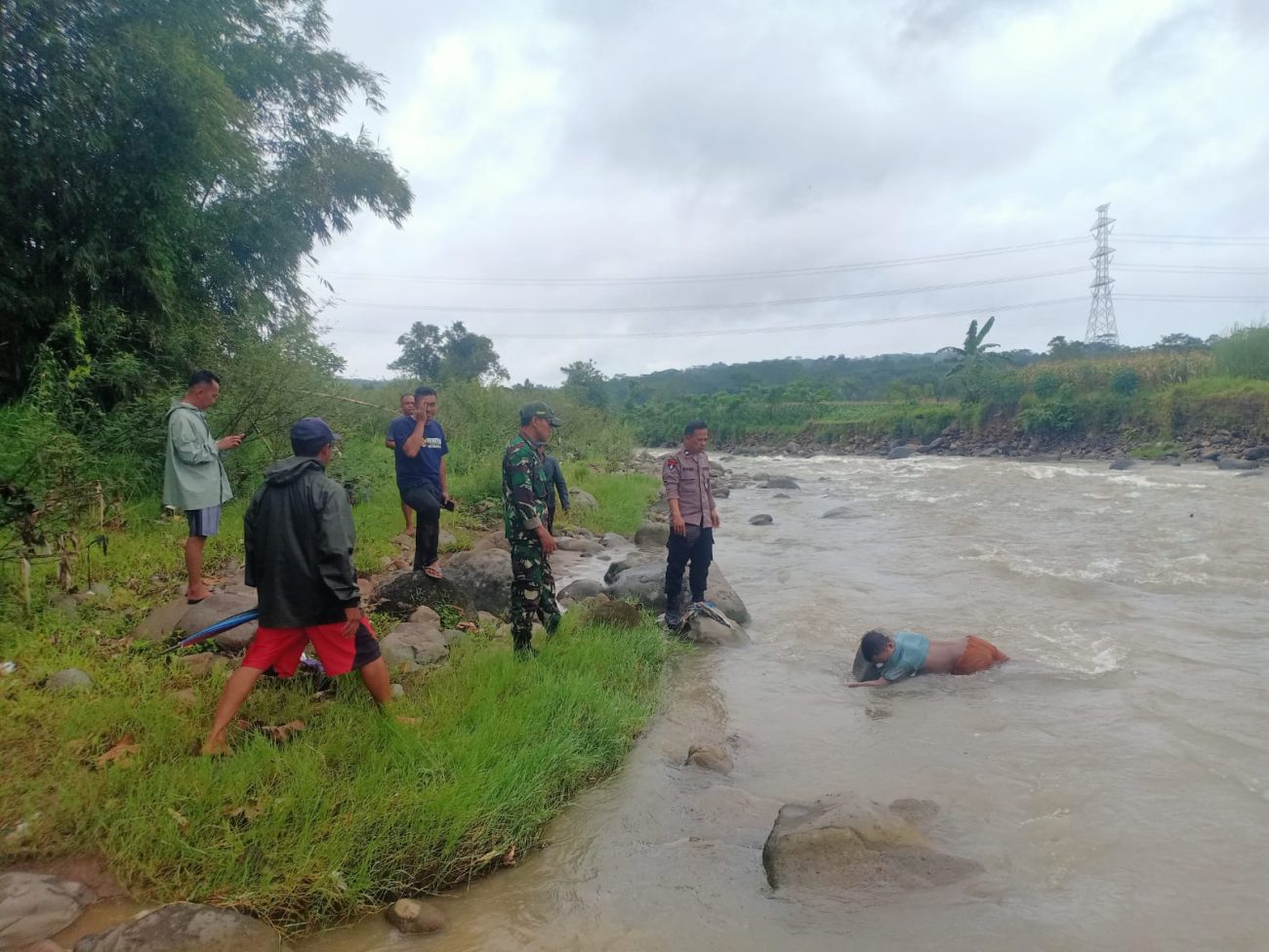 b. Sesampainya di sungai melihat seorang laki laki yang diduga sudah meninggal dunia dan tersangkut bebatuan.