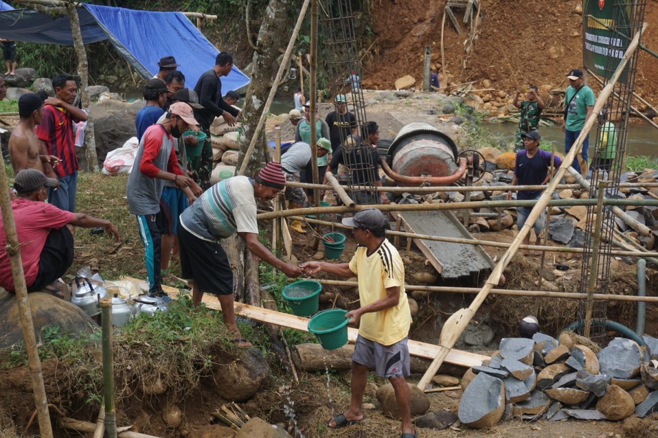 Personil Koramil 07/Bandar bersama masyarakat melaksanakan pengecoran pondasi tiang jembatan. Jembatan ini nantinya akan menjadi akses vital yang menghubungkan aktivitas warga sehari-hari baik dalam bidang ekonomi, pendidikan, maupun akses layanan kesehatan.